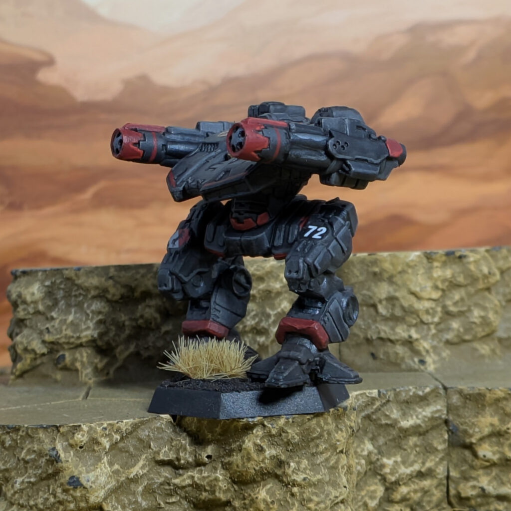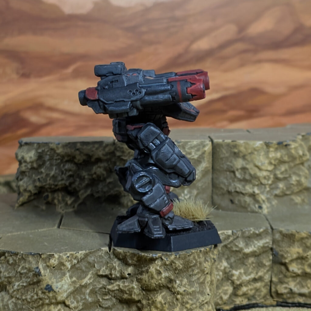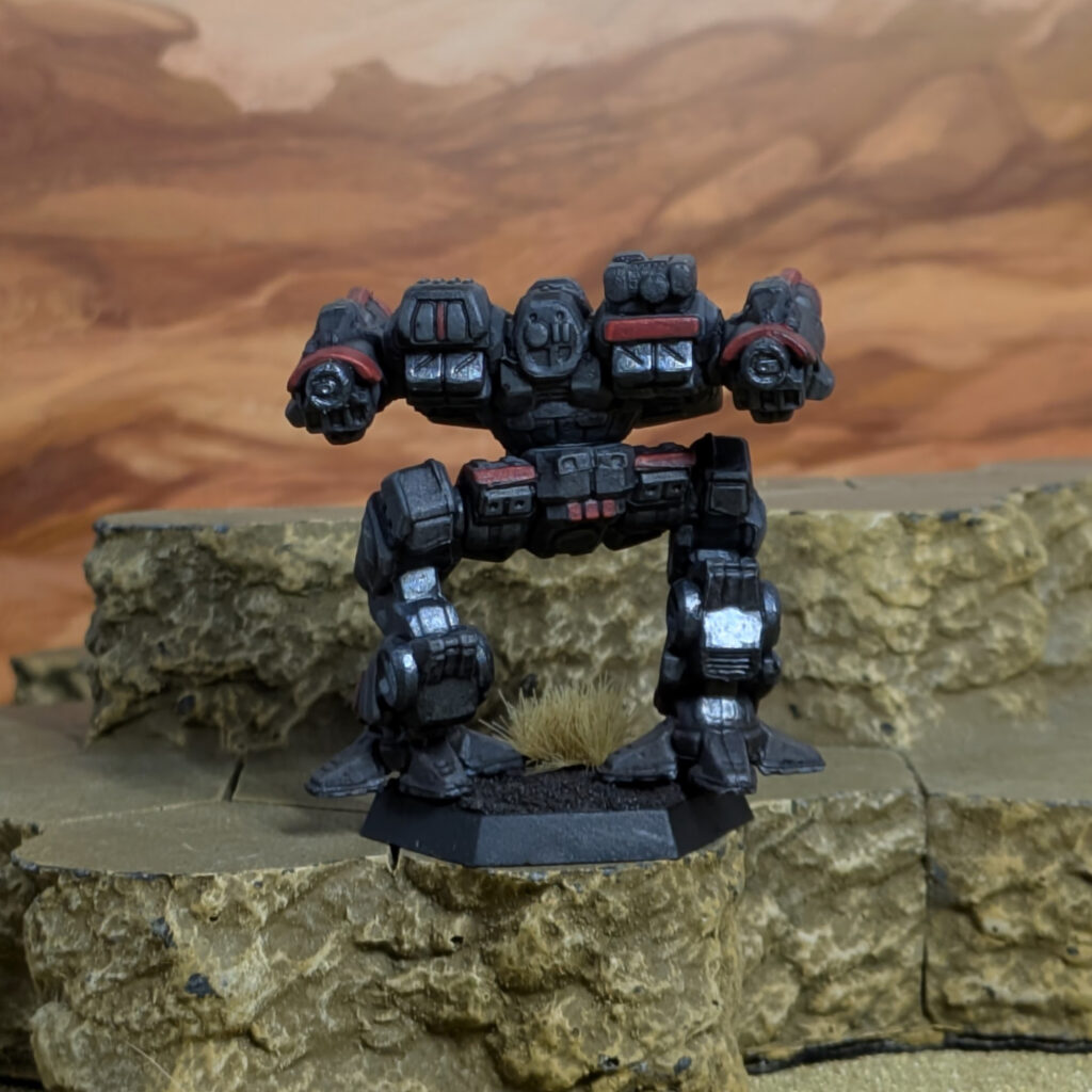 Black primer, zenithal white. Basecoat in Two Thin Coats Wizard Grey, then a coat of Army Painter Speedpaints Gravelord Grey. The red accents are Two Thin Coats Sanguine Red. Edge highlights on the grey portions are in Wizard Grey and the red accents are in Two Thin Coats Demon Red. Metallics are TurboDork Six Shooter with TurboDork Silver Fox for the highlights.