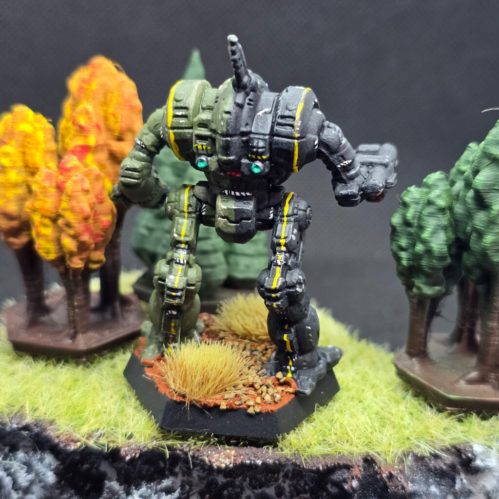 This paint scheme was an original one that was to be used for a Hinterlands Campaign that was to be run in my area, but got canceled. The group was to be a Merc Company that was the same unit, just different Sections. We had decided on the Pateros Lancers (Pateros was the original name of a river in the region that has since been renamed) I wanted a scheme for my section that represented the Two major universities of the state Black and Gold and Green and Gold. This unit was to be The Vaqueros.