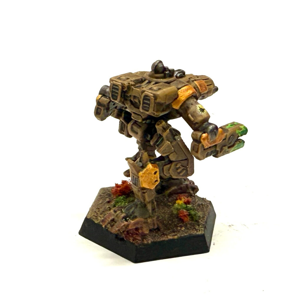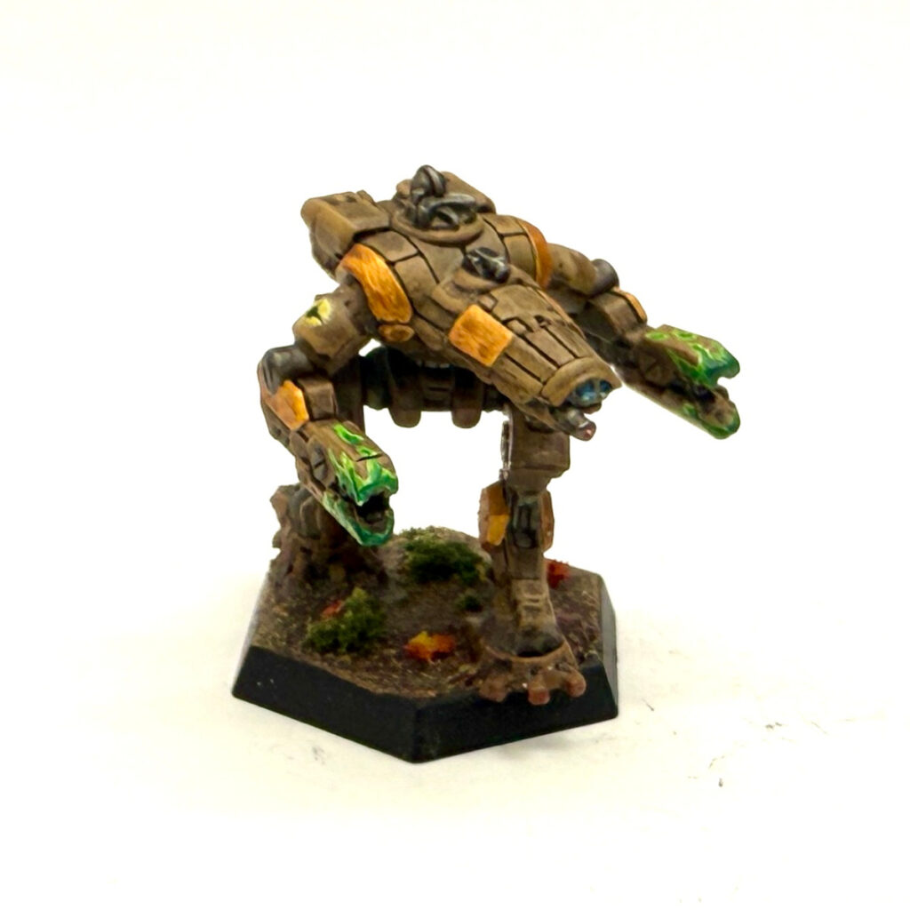This is a Crab painted in Seeker Galaxy colors. The mini was painted using Army Painter paints. It was primed black and then an Oak Brown base coat was applied. A wash using Soft Tone was added, and then a lighter brown (a mix of Oak Brown and Desert Yellow) was dry brushed for the highlight. Daemonic Yellow was applied before the Greedy Gold to help with the gold’s opacity issue. The claws were painted to simulate the “poison” effect that Seeker Galaxy warriors use to represent their preferred color. White was used as a “base” for the poison before adding the greens.