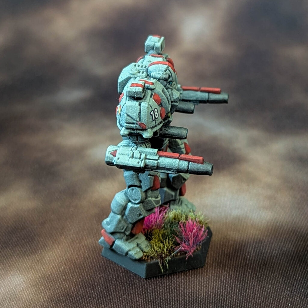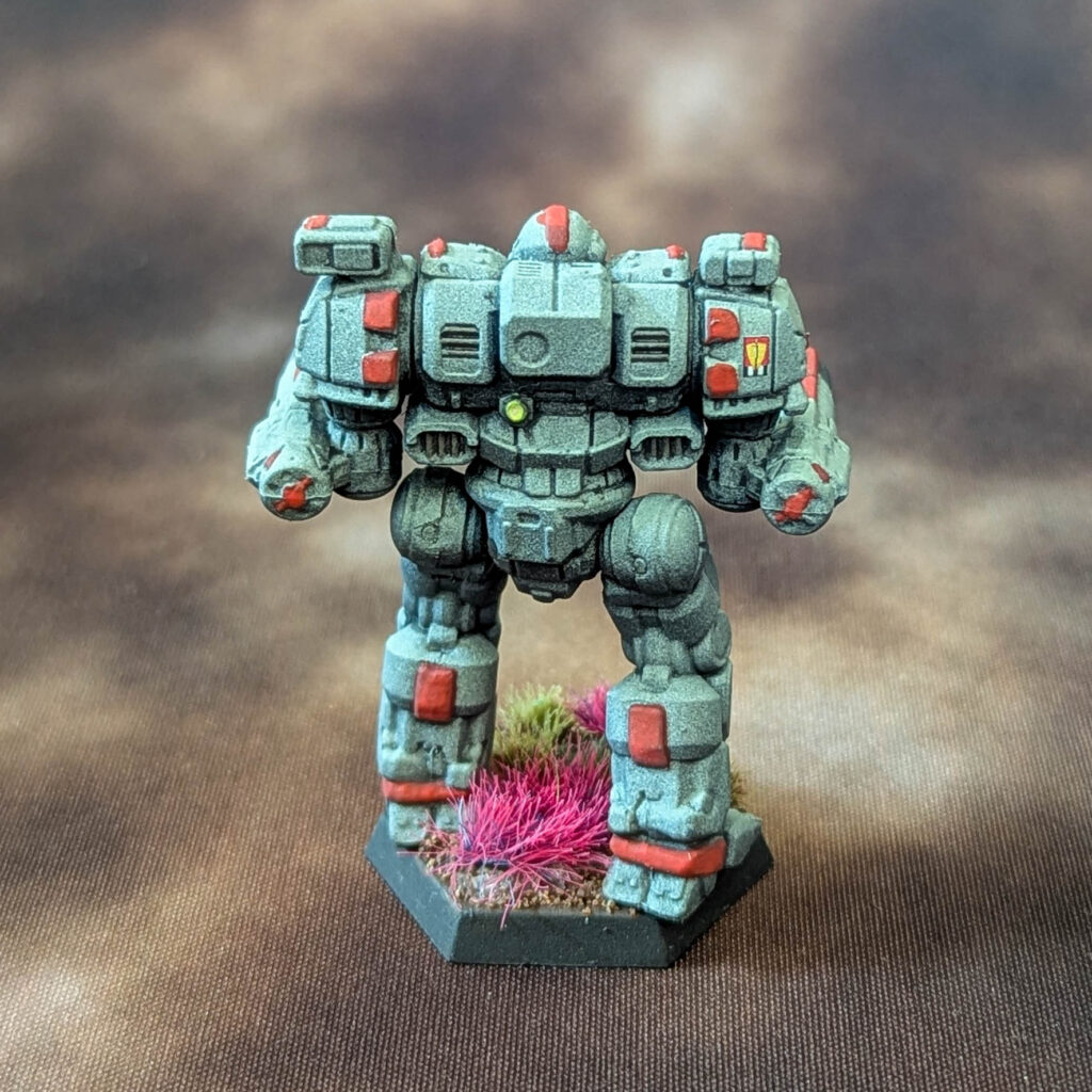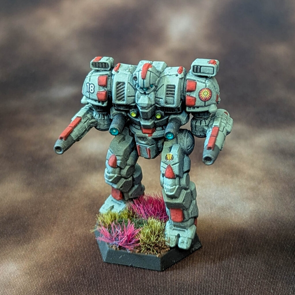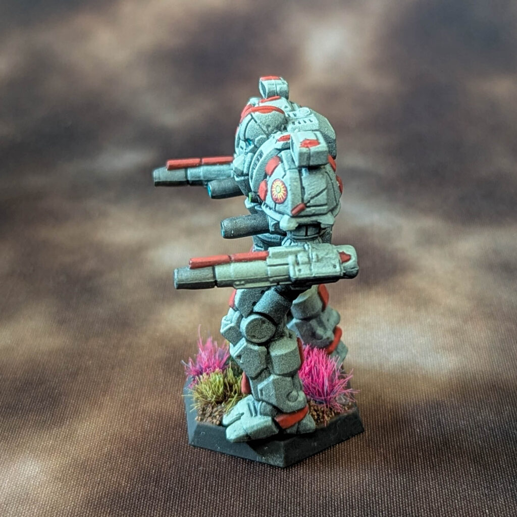 The mini was primarily airbrushed using Pro Acryl paint. Starting with a Black Primer, the grey is built up in a zenithal manner, starting with Dark Warm Grey, Warm Grey, and finally Bright Warm Grey. The details are then done with a normal brush. The red is built up starting with Burnt Red, Bold Pyrrole Red, and Orange Red. The cockpit is done with Dark Jade, Jade, and B