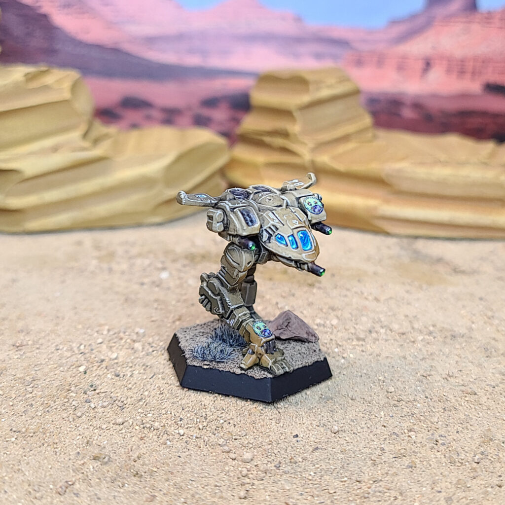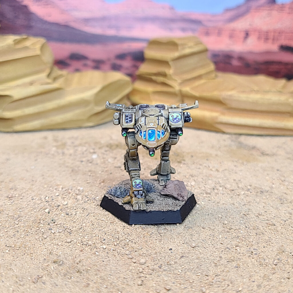 The miniature was primed with Vallejo Black primer and then base coated with Citadel Karak Stone. Using an airbrush, small spots and bands of AK Camouflage Green and AK British Khaki. It was then varnished with a gloss varnish and given a panel line wash with Tamiya Panel Line Accent Color Black. Edge highlights, chipping, and scratches were made with AK Decomposed Flesh and Vallejo German Chocolate Black Brown. Weapon Barrels and exposed gears were painted with Vallejo Air Steel and washed with Citadel Nuln Oil. The cockpit was painted with AK Deep Blue, AK Ducat Blue, AK Deep Sky Blue, and AK Snow Blue. The medium lasers were painted with Citadel Caliban Green followed by Caliban Green mixed with Citadel Moot Green, Moot Green, and then Moot Green mixed with AK White. Burn mark patina on the barrels were made with a wash of Citadel Drakenhof Nightshade, Citadel Druchii Violet, and Citadel Seraphim Sepia