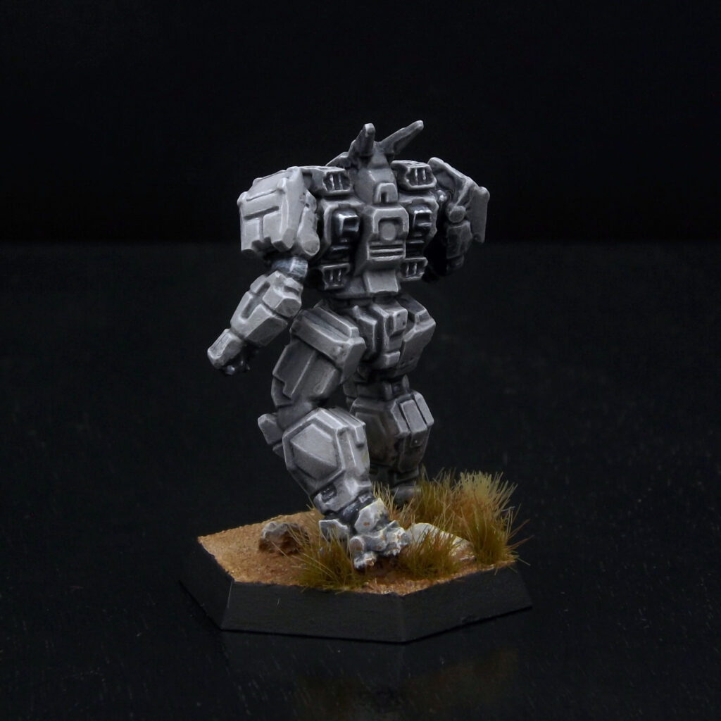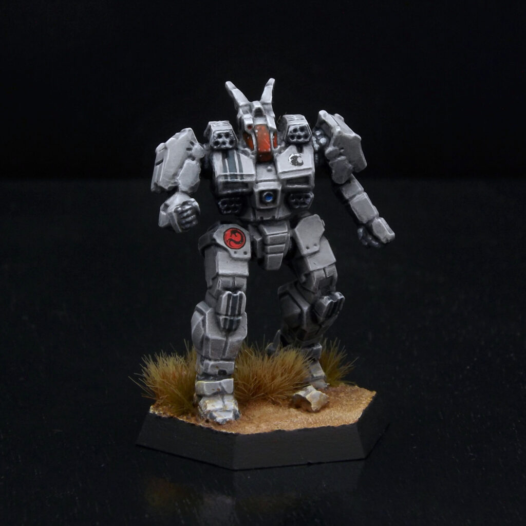 Base coat of Vallejo Model Color Dark Sea Grey with a hint of Golden SoFlat Matte Acrylic Burnt Umber, wash of Citadel Drakenhof Nightshade. Build up with layers of the base color, then the base mixed with a little VMC White. Very fine edge highlight in VMC White. Gray metal painted with VMC Black, VMC Dark Sea Green, VMC Dark Sea Grey, and VMC White. The black stripes are VMC Black and Privateer Press P3 Coal Black. Emblems are decals.