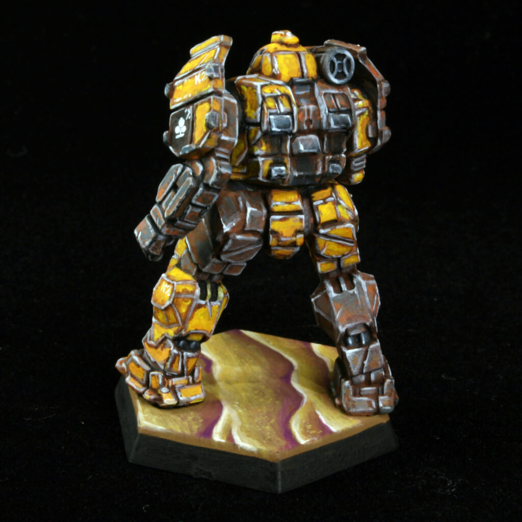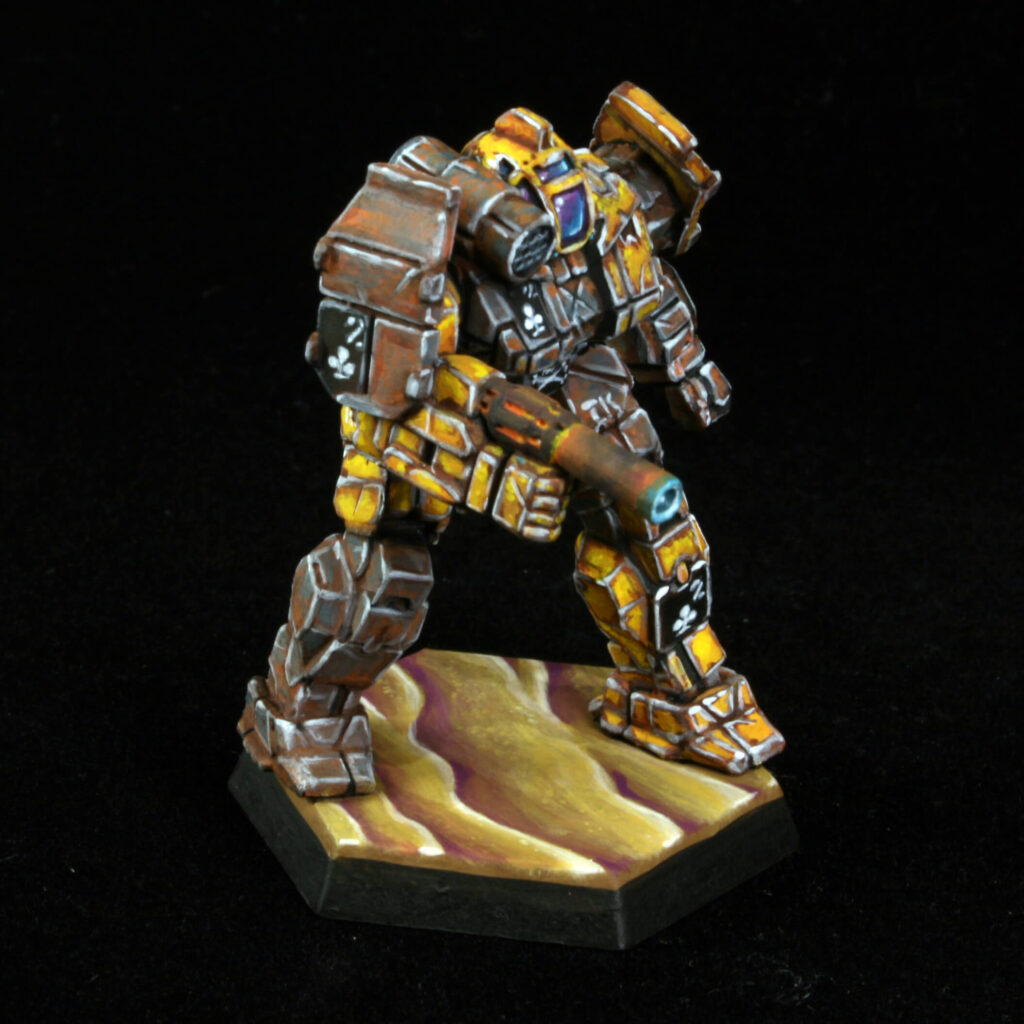 This miniature was painted using Scalecolor paints. I started with Orange Leather and layered up with Mars Orange to Sol Yellow. I put sloppy edging and stippling with Brown Leather, followed up with Rainy Gray to make a paint chipping effect. The base was done with a base coat of Sunset Purple. I traced the waves of sand with sunset purple and then blended up with Arabic Shadow to Sahara Yellow to Pale Skin.