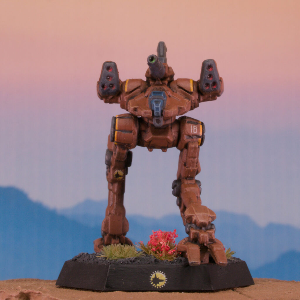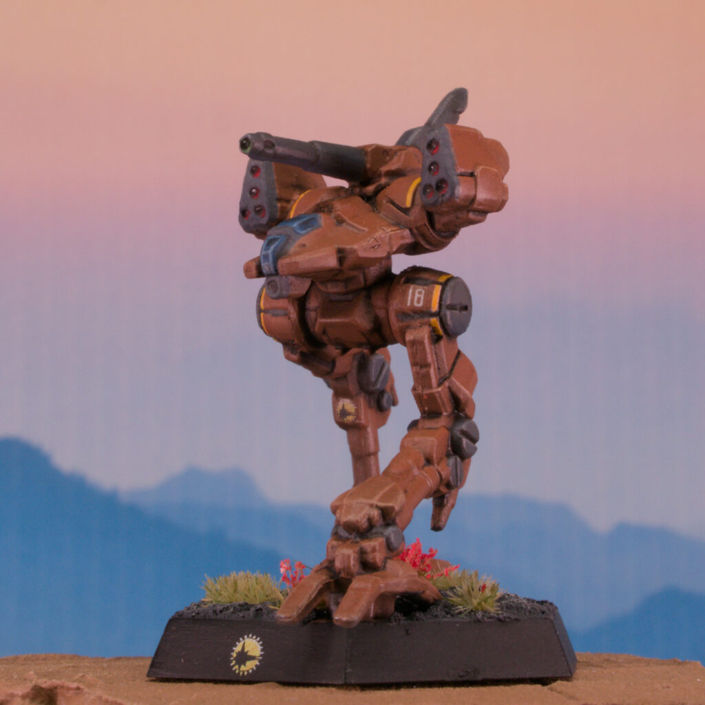 3. Apply accents and cockpit/weapon/lens jeweling: a. Yellow Accents: Undercoat PA Pink, basecoat AK Volcanic Yellow. b, Grey Accents: Basecoat Warpainter Fanatic Deep Grey, highlight WPF Uniform Grey, PA Payne’s Grey shade. c. Cockpit glass: Base of PA Blue Black, progressive glazes of Reaper Master Series (RMS) Breonne Blue, RMS Ashen Blue, and 1:1 RMS Ashen Blue – VMC Sky Blue. d. Green Lens: basecoat VMC Black Green basecoat, VMC Intermediate Green, WPF Emerald Forest, then VMC White for the spot shine. e. Red Lens: Basecoat PA Black Brown, VMC Red, VMC Vermillion, then VMC White for the spot shine.