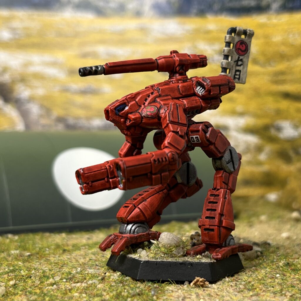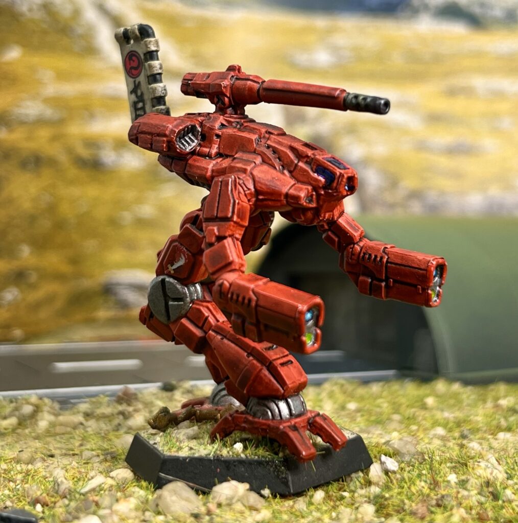 6. Paint additional details such as cockpit and weapons. PPCs were painted with Citadel Contrast Frostheart; mix in white with the Frostheart for the center highlight. Medium Lasers were painted white then painted with Citadel Tesseract Glow. Auto canon barrel blueing was created using layers of Citadel Seraphim Sepia and Citadel Tyran Blue shades. Back banner was painted Vallejo Model Color Ivory, then washed with the Seraphim Sepia shade.