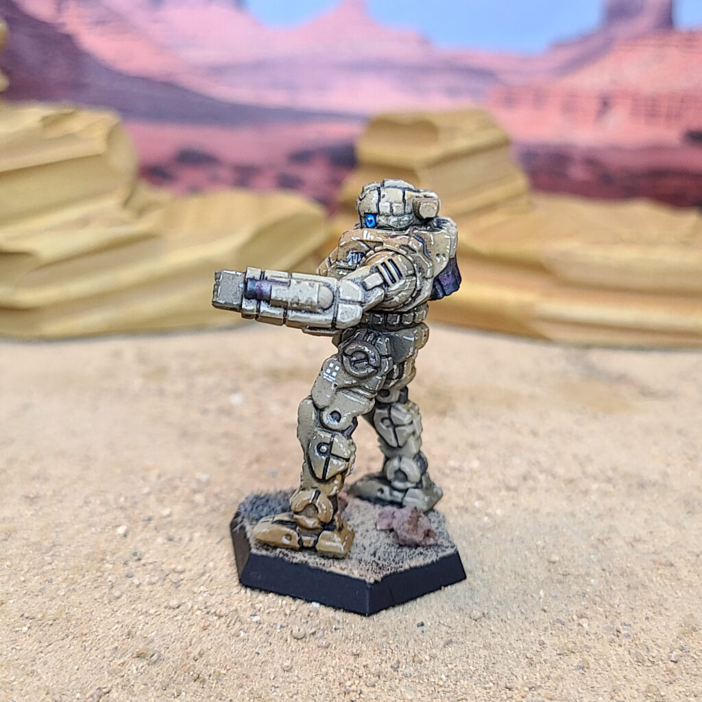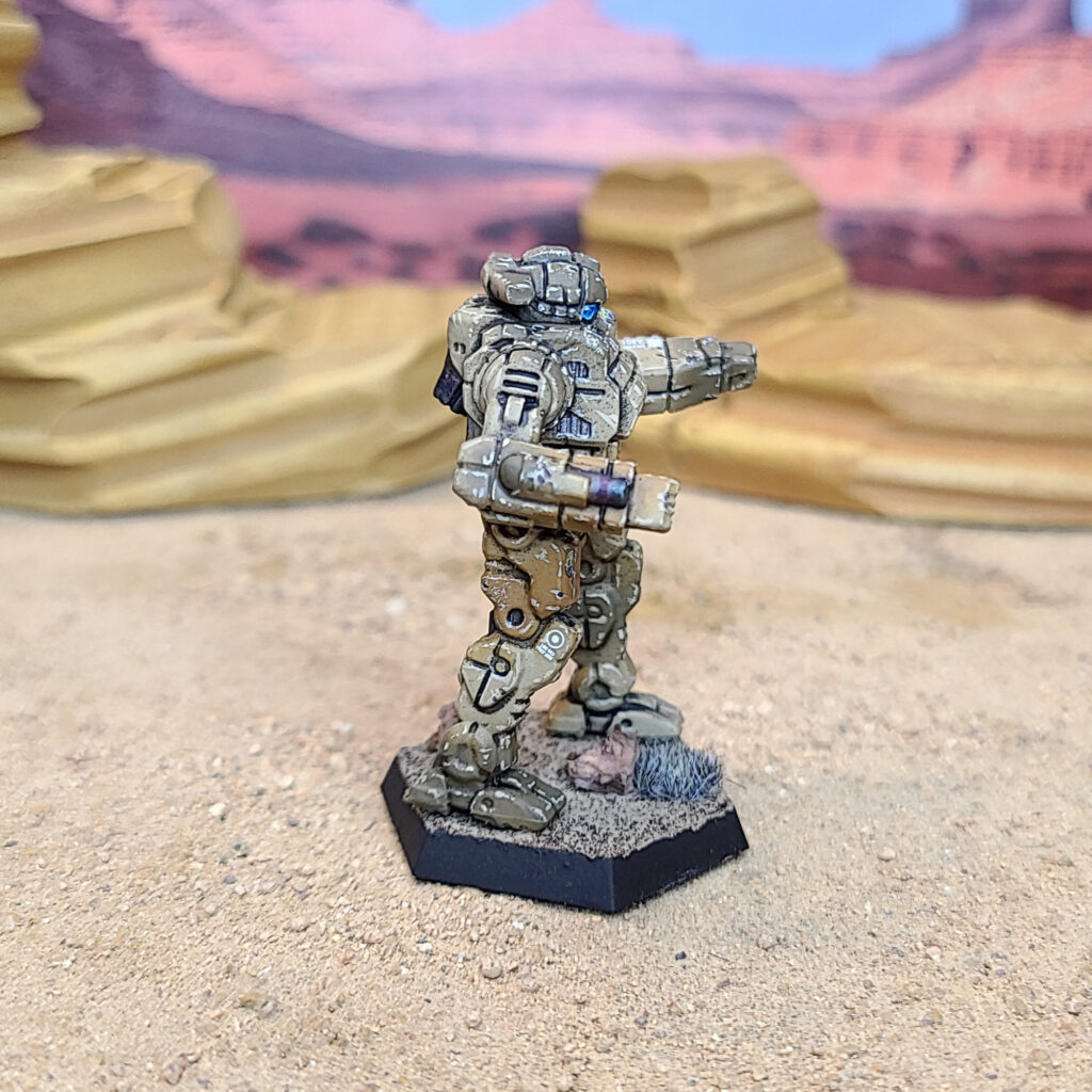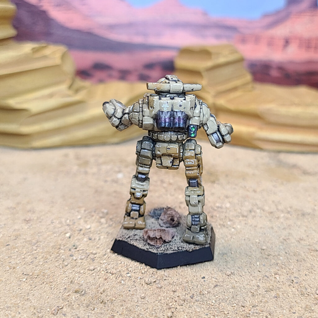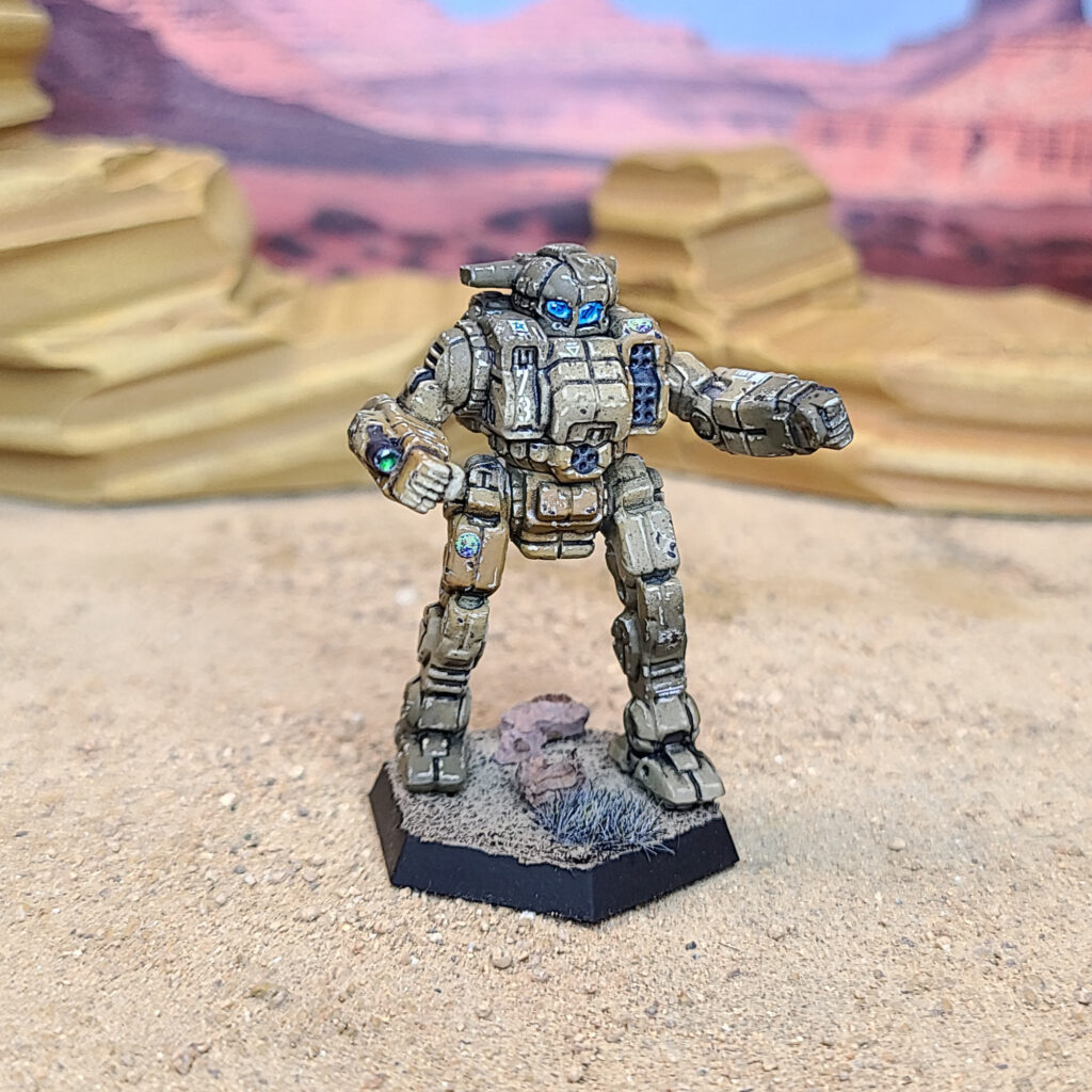 The miniature was primed with Vallejo Black primer and then base coated with Citadel Karak Stone. Using an airbrush, small spots and bands of AK Camouflage Green and AK British Khaki. It was then varnished with a gloss varnish and given a panel line wash with Tamiya Panel Line Accent Color Black. Edge highlights, chipping, and scratches were made with AK Decomposed Flesh and Vallejo German Chocolate Black Brown. Weapon Barrels and exposed gears were painted with Vallejo Air Steel and washed with Citadel Nuln Oil. The cockpit was painted with AK Deep Blue, AK Ducat Blue, AK Deep Sky Blue, and AK Sky Blue. The medium lasers were painted with Citadel Caliban Green followed by Caliban Green mixed with Citadel Moot Green, Moot Green, and then Moot Green mixed with AK White. Burn mark patina on the barrels were made with a wash of Citadel Drakenhof Nightshade, Citadel Druchii Violet, and Citadel Seraphim Sepia
