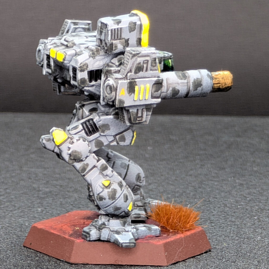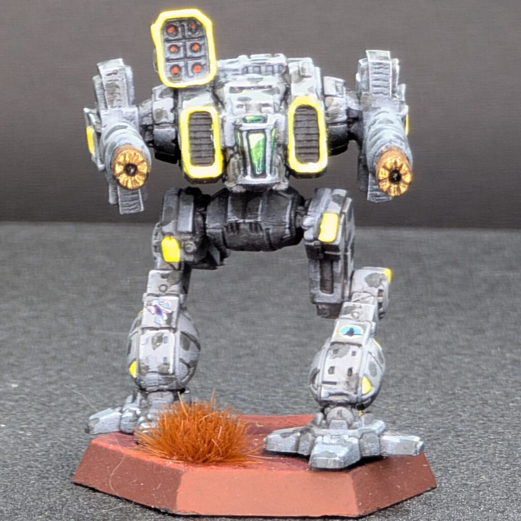 Brush: Apply spots in 71.056 Panzer Dk. Grey. Paint actuators in Reaper 09437 Dragon Black, and yellow highlights first in 09039 Pure White then 09409 Canary Yellow. Airbrush a light coating of Future, then apply Citadel Nuln Oil. Edge highlight with Reaper 09088 Stormy Grey, 09038 Rainy Grey, and 09090 Misty Grey. Paint cockpit with 09410 Dragon Green, 09414 Cats-Eye Green, and 09415 Dungeon Slime. Paint base with Citadel Martian Ironearth washed with Carroburg Crimson. Then drybrush with Reaper 09072 Rust Brown, and paint hex sides with 09070 Mahogany Brown and 09071 Chestnut Brown.