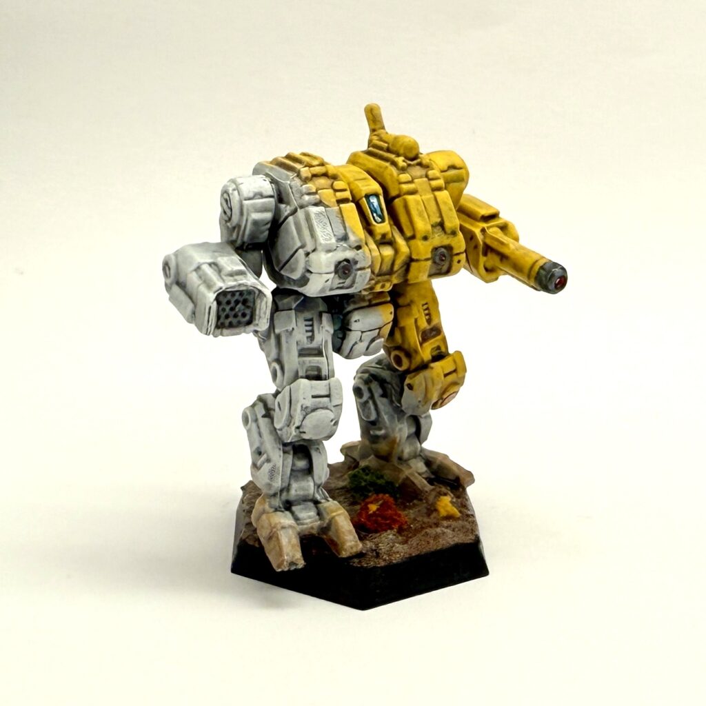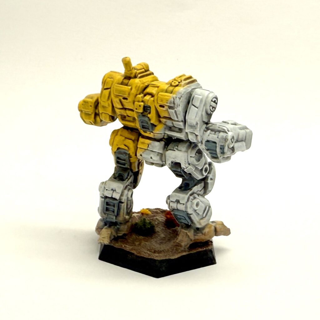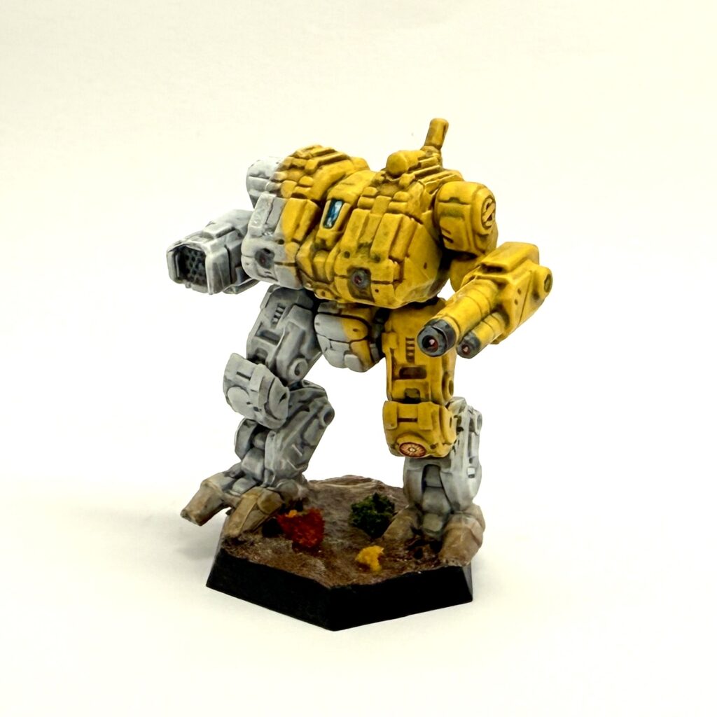 This is a Thanatos in House Davion’s Dawn Guard colors. It started with a black primer from Rustoleum. All other paints were Army Painter Fanatic. The yellow side began with a heavy dry brush of Daemonic Yellow. Dry brush was chosen as a way to apply the yellow with decent coverage. After the proper coverage was achieved, a Soft Tone wash diluted with Wash Medium was applied. A light dry brush of Daemonic Yellow and Ice Yellow followed to even out the stains from the wash. The white side was also a heavy dry brush of a very light grey from White and Ash Grey. A diluted Dark Tone wash was then applied, with a dry brush of White to follow. Gun barrels and joints were painted with Cobalt Metal metallics. The cockpit canopy was done with Imperial Navy, Crystal Blue, Bright Sapphire, and White.