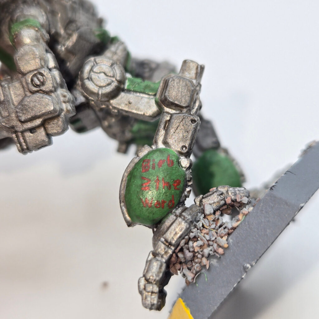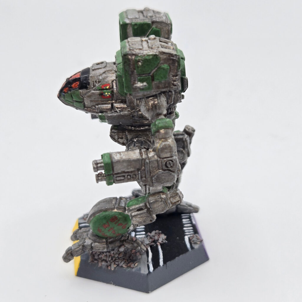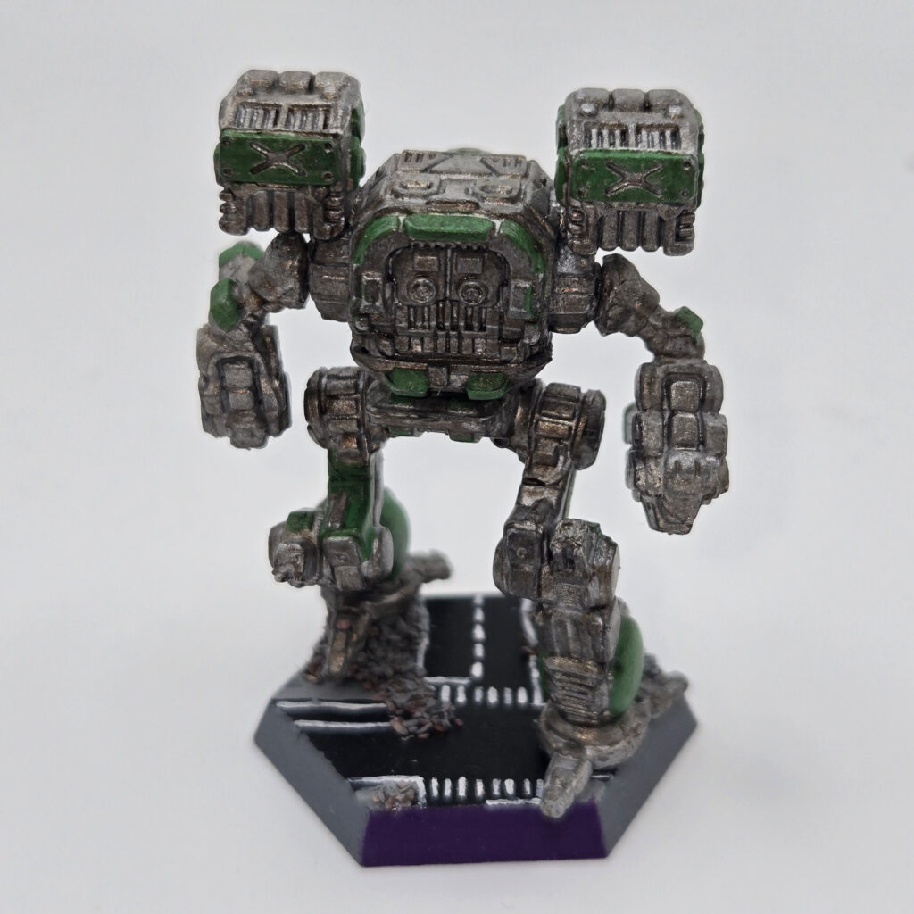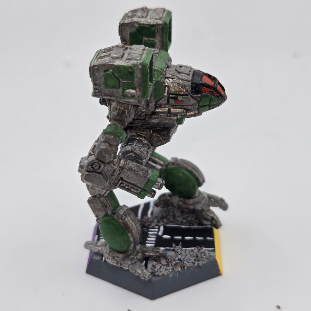 Priming was done with 2+ coats of Vallejo Grey surface primer (applied by brush). Base coat was 2+ thin coats of AP Shining Silver until primer layer is no longer visible, across full model. Base coat was augmented first with a heavy Dry brush of AP Necromancer Cloak, across full model. Then a lighter drybrushing of AP Ash Grey, across full model. Primary Accent color was AP Goblin Green, applied with multiple thin layers untill the base coat was no longer visible underneath. Mechanical joints/exposed sensors and many other greebles are painted with 1-2 coats of AP Plate Mail Metal. Weapons are painted with 1-2 coats of AP Gun Metal. Cockpits, hand actuators, Jumpjets (if applicable), the back of lenses are painted with 1-2 coats of AP Matte Black. Wash is 1-2 coats of watered down AP Strong tone across full model (watered down via applying wash using a brush with no/minimal removal of excess water after washing, depending on how watery the rest of the wash on the palette was). Basing was 2 coats of AP Uniform grey as the basecoat. Roads were freehanded with AP matte Black as the base with road markings made with freehanded Matte White, and sidewalks done with AP Ash Grey. Debris was done with AP Brown Battlefield glued to base then coated with a layer of AP Ash Grey. Missile tubes were painted with several layers of Demonic Yellow until the missile tubes were filled and presented a flat surface or as close as possible. Lasers lenses were done with 1-2 coats of AP Hydra Turquoise. Autocannon bore was filled with AP matte black and muzzle was Drybrushed with AP matte black. Clan Jade Falcon logo was freehanded with a base of AP Army Green. Border was made with AP Pure Red. Rectangle… thingy, was made with AP Ash Grey. Bird was freehanded with AP Goblin green. Sword was made with a base layer of AP Uniform Grey, then a thin highlight line of AP Ash grey, with a hilt done with AP Matte Black. Finally beak and claws were done with AP Moon dust. Mech was clear coated with a layer of Citadel technical Stormshield paint applied by brush to the full model (minus base) Lenses and Cockpits were done first with the base layer of AP Matte Black. then 2+ layers of AP Lava Orange. Then a wash of AP Blue tone was applied to the cockpits/lenses. After the clear-coating, a final layer of Citadel Technical Spiritstone Red was applied.