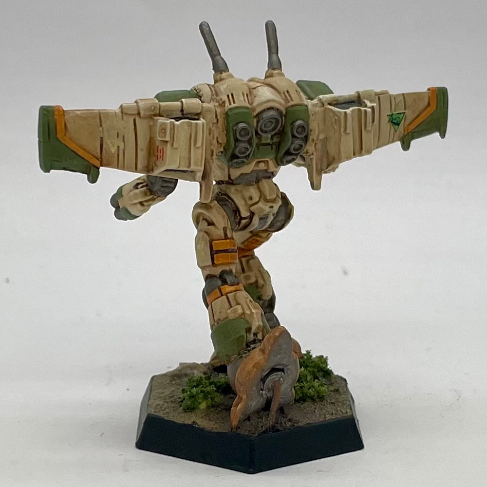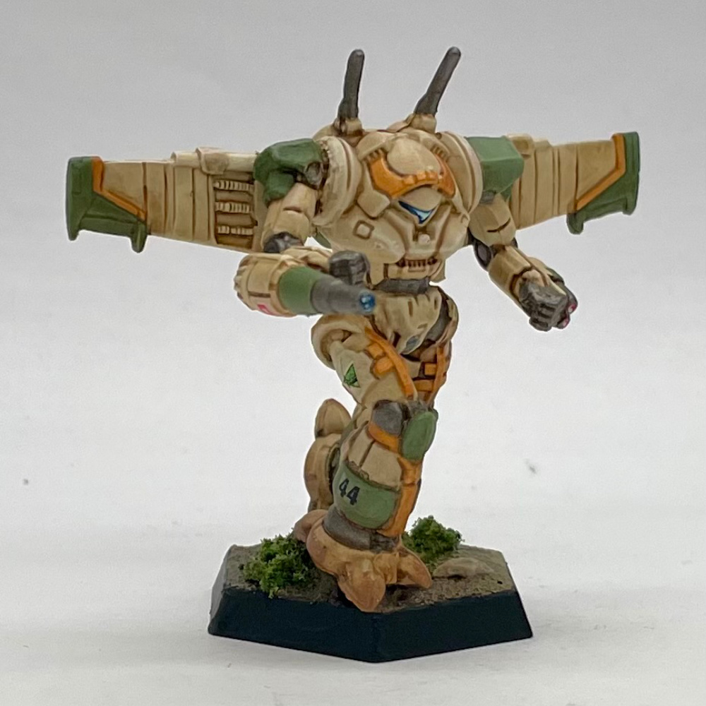 This Wing Wraith was customized from the Alpha Strike box set using wings from Iron Wind Metal’s “Wraith Alexander” and reposed for a more dynamic running pose. It was primed with Army Painter white primer. The base coat is AP Fanatic’s Ancient Stone followed by a wash of diluted AP Soft Tone. Once the wash dried, a dry brush of Ancient Stone was applied. The green was AP Army Green with a slight wash of Soft Tone. Final accents were done with AP Greedy Gold. The joints and gun barrels were a mixture of Vallejo Airbrush Metal Color Steel and AP Gun Metal.